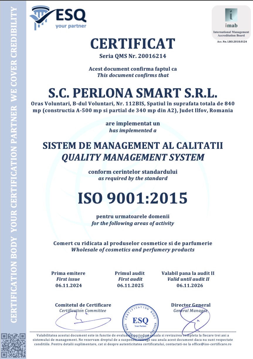 Noi, PERLONA SMART SRL, declaram pe proprie raspundere ca produsul/produsele mentionate in prezenta factura au fost fabricate cu respectarea principiilor de Buna Practica de Fabricatie/GMP, in conformitate cu cerintele Regulamentului (CE) nr. 1223/2009 al Parlamentului European şi al Consiliului din 30 noiembrie 2009 privind produsele cosmetice, precum si ale Regulamentului (UE) nr. 655/2013 Comisiei din 10 iulie 2013 de stabilire a unor criterii comune pentru justificarea declarațiilor utilizate în legătură cu produsele cosmetice, respectiv Regulamentul (CE) nr. 648/2004 al Parlamentului European şi al Consiliului din 31 martie 2004 privind detergenţii si sunt fabricate in conformitate cu specificatiile tehnice. Raportul calitate-pret al produselor si serviciilor oferite de noi, este cel mai bun de pe piata, iar satisfactia dumneavoastra este obiectivul nostru prioritar. Toate produsele noastre satisfac cele mai exigente standarde de calitate si biodegrabilitate,fapt atestat de certificatele ISO 9001:2008; ISO 22000:2005; ISO 22716:2007 al fabricilor producatoare. In toate fabricile se respecta cu strictete tehnologia si patentele firmei mama , toate procesele de fabricatie fiind atent monitorizate.